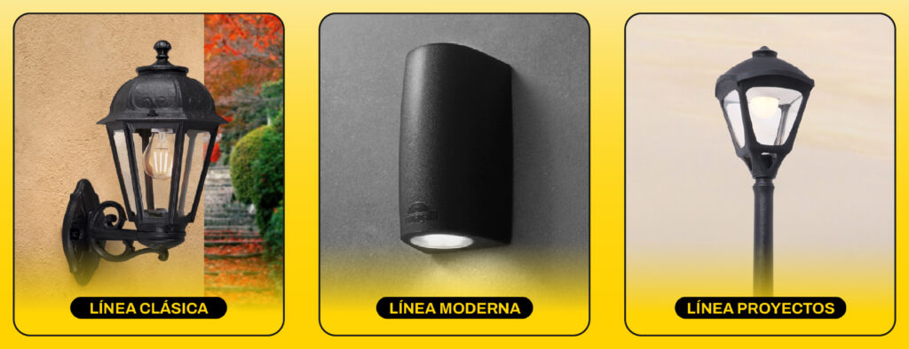 - Línea Moderna: luminarias con líneas simples y contemporáneas, ideales para fachadas, terrazas o entornos urbanos minimalistas.