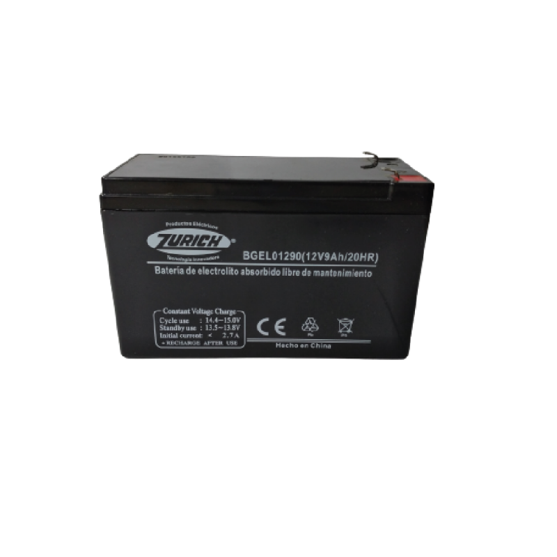La batería Zurich de 12V y 9Ah es una batería de gel diseñada para aplicaciones como sistemas de alimentación ininterrumpida (UPS), alarmas, luces de emergencia y linternas. A continuación, se detallan sus especificaciones técnicas: