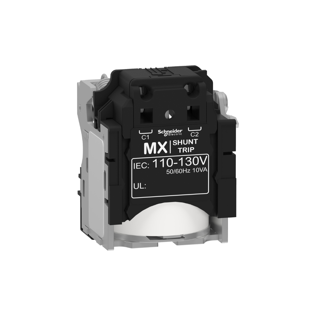La bobina MXP NSX100-630 110-130V es una liberación de disparo MX para disyuntores Compact NSX, PowerPact Multiestándar y EasyPact CVS. Su tensión nominal es de 110 a 130 V CA 50/60 Hz. Es un auxiliar utilizado para aplicaciones de apagado de emergencia o de apertura remota. Este auxiliar abre el interruptor automático cuando la tensión de control Un se eleva por encima del 70% de su tensión nominal Un. Cumple con el estándar IEC 60947-2. Este disparo de derivación es un accesorio de interruptor automático certificado por UL/CSA. Compact NSX, PowerPact Multiestándar y EasyPact CVS pueden equiparse con 1 MX o 1 MN auxiliar.