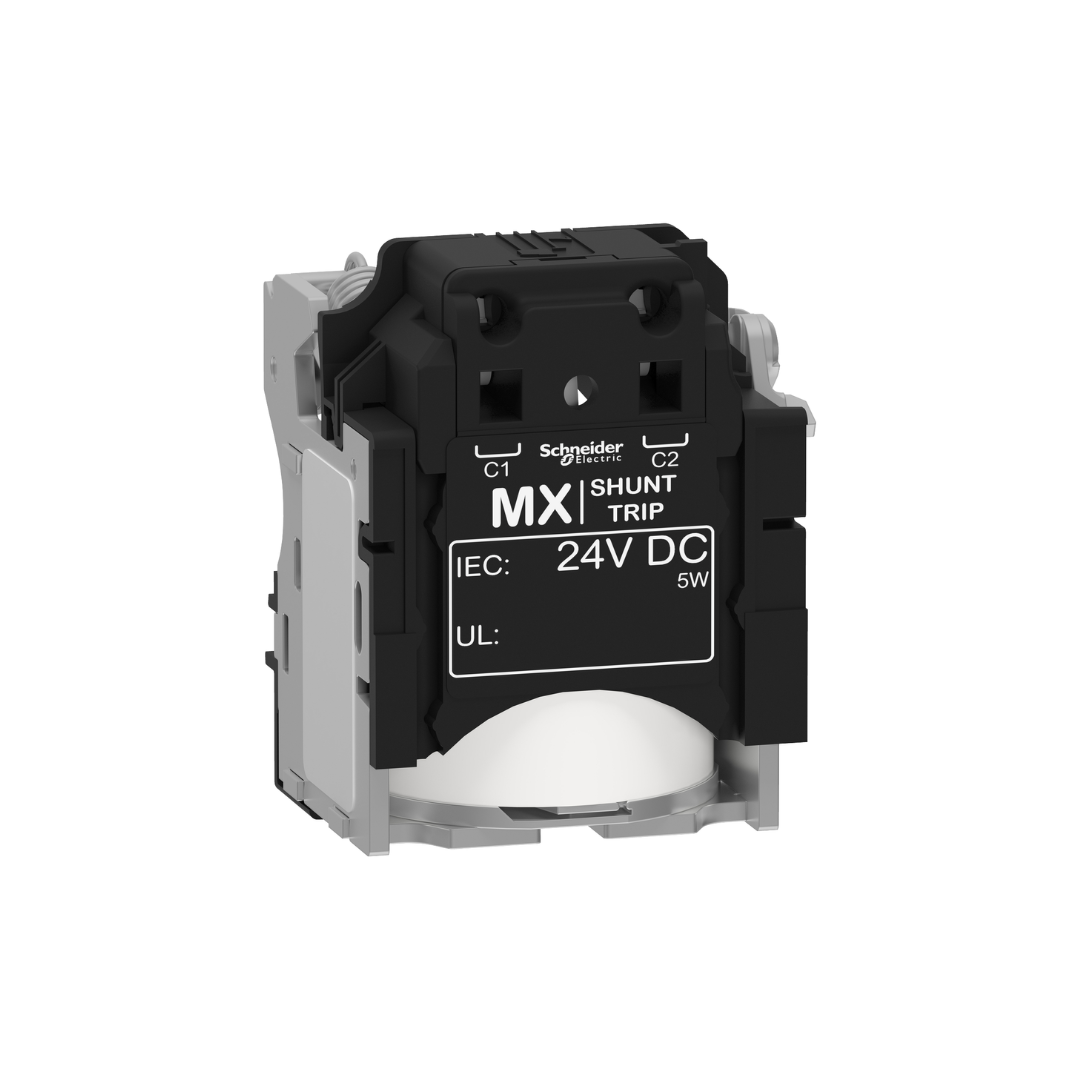 La bobina MXP NSX100-630 24V es una liberación de disparo MX para disyuntores Compact NSX, PowerPact Multiestándar y EasyPact CVS. Su tensión nominal es de 24 V CC. Es un auxiliar utilizado para aplicaciones de apagado de emergencia o de apertura remota. Este auxiliar abre el interruptor automático cuando la tensión de control Un se eleva por encima del 70% de su tensión nominal Un. Cumple con el estándar IEC 60947-2. Este disparo de derivación es un accesorio de interruptor automático certificado por UL/CSA. Compact NSX, PowerPact Multiestándar y EasyPact CVS pueden equiparse con 1 MX o 1 MN auxiliar.