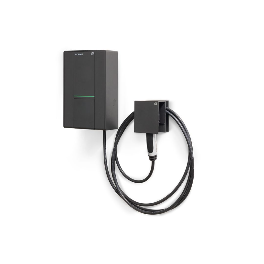 Cargador para vehículo eléctrico Wallbox 7 kW con base y cable Tipo 2 de 5 metros, ideal para uso residencial o comercial. Funciona a 230 V, 32 A, con protecciones IP55 e IK10 para máxima seguridad. Fabricado en polímero técnico resistente a UV y ambientes salinos. Instalación mural y diseño en color gris oscuro.