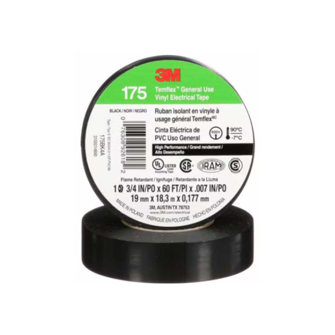 La Cinta Eléctrica de Vinilo 3M™ Temflex 175 negra es una cinta aislante de vinilo de uso general, de alto rendimiento y de 0,18 mm (7 milésimas de pulgada) de espesor. Está diseñada para funcionar en temperaturas ambiente de hasta 90 °C (194 °F). La cinta es adaptable para aplicaciones en climas fríos de hasta –7 °C (19 °F). Tiene excelente resistencia a la abrasión, humedad, álcalis, ácidos, corrosión del cobre y condiciones climáticas variables. La combinación de un respaldo de PVC elástico y un adhesivo a base de caucho sensible a la presión proporciona protección eléctrica y mecánica con un volumen mínimo. No se utilizan solventes en el proceso de fabricación.