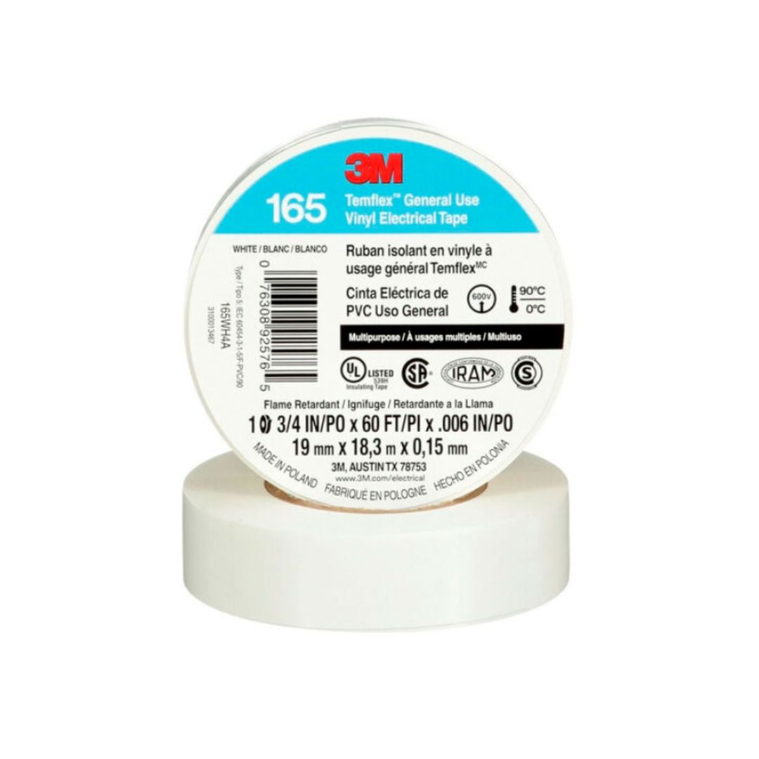 La Cinta AISLADORA TEMFLEX BLANCA Eléctrica de PVC 3M™ Temflex™ 165 es una cinta aislante de vinilo multiuso de buena calidad. Tiene gran resistencia a la humedad y a las condiciones climáticas variables. Es una cinta de cloruro de polivinilo (PVC) ignífuga y adaptable. La cinta 3M Temflex 165 proporciona una gran protección mecánica con un volumen mínimo. Es una cinta aislante certificada por CSA y listada por UL. No se utilizan solventes en el proceso de fabricación.