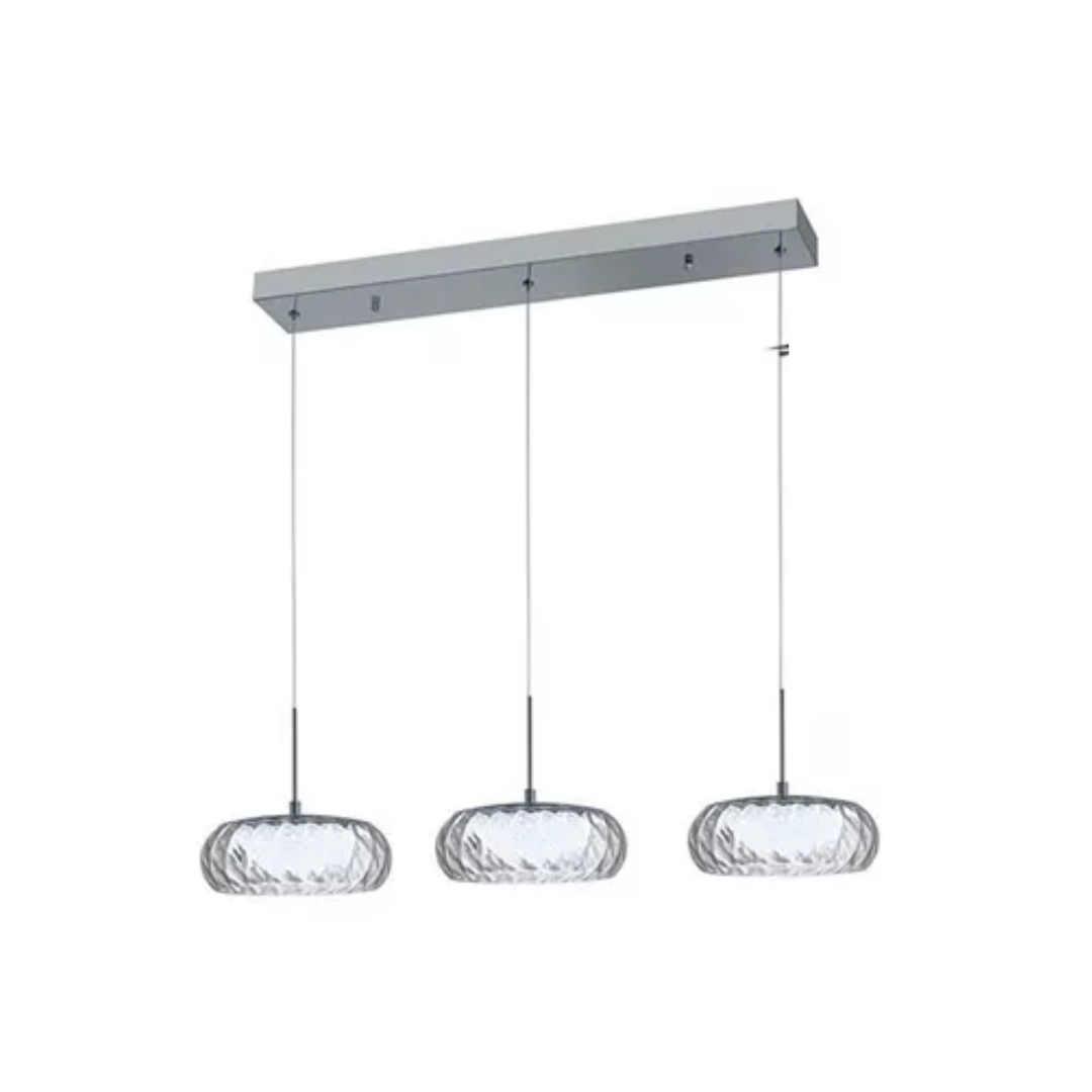 Colgante LED de 3 luces con terminación en cromo y tulipas de cristal abrillantado. Ideal para living comedor.