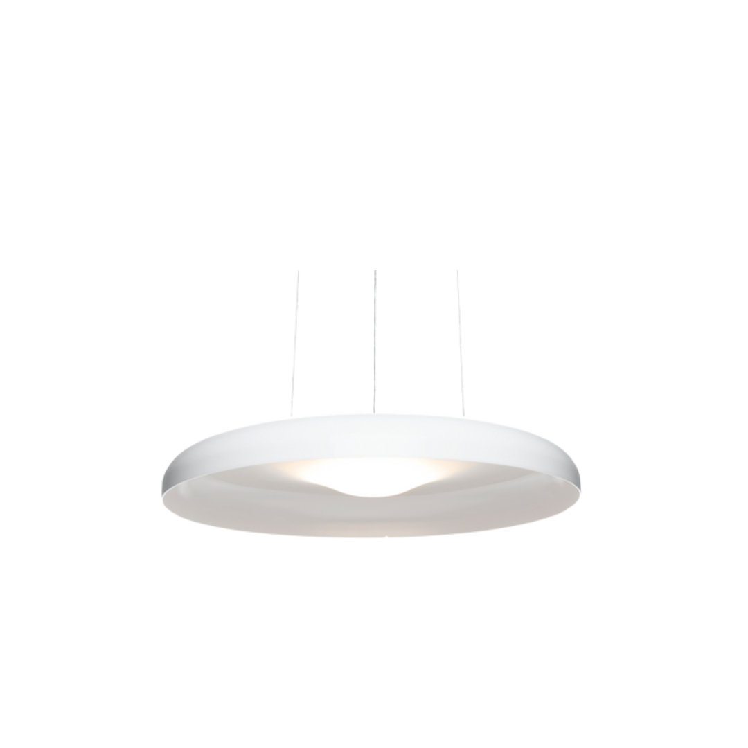Lámpara de suspensión de luz semi directa. Cuerpo en aluminio. Difusor de metacrilato esmerilado. Tensores teflonados conductores de 24V. Florón porta-driver.