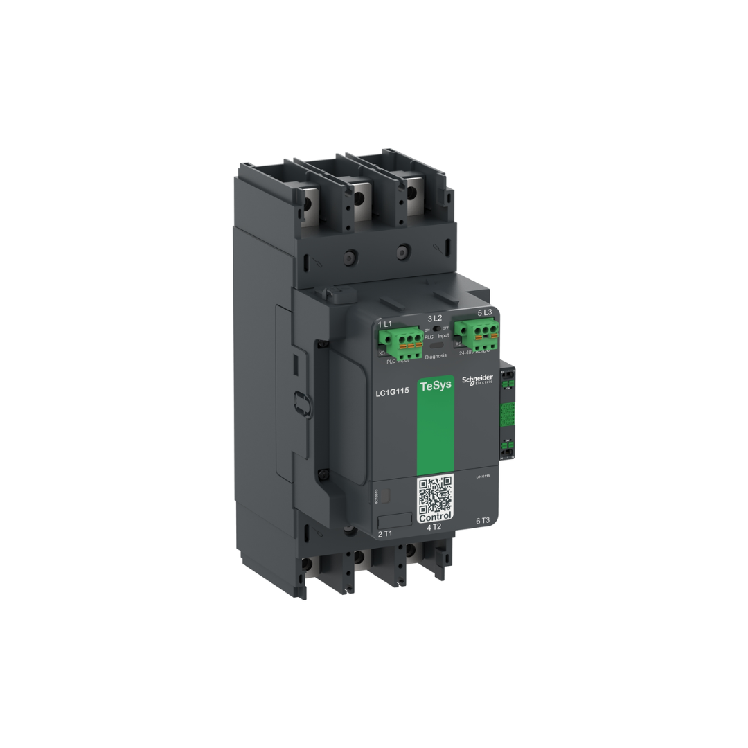 Contactor Tripolar 150A 24-48V CACC de alta potencia TeSys Giga, 3 polos (3 NA) adecuado para aplicaciones categoría AC-3 de hasta 150 A 90kW@440V, equipado con bobina electrónica de bajo consumo de banda ancha de 24-48V AC/DC, Control de salida PLC integrado con bloque de contactos auxiliares 1 NA + 1 NC altamente confiable (17 V 1 mA). Diseñado para aplicaciones exigentes con velocidades de operación máximas de hasta 500 ciclos por hora y entornos de hasta 60°C.
