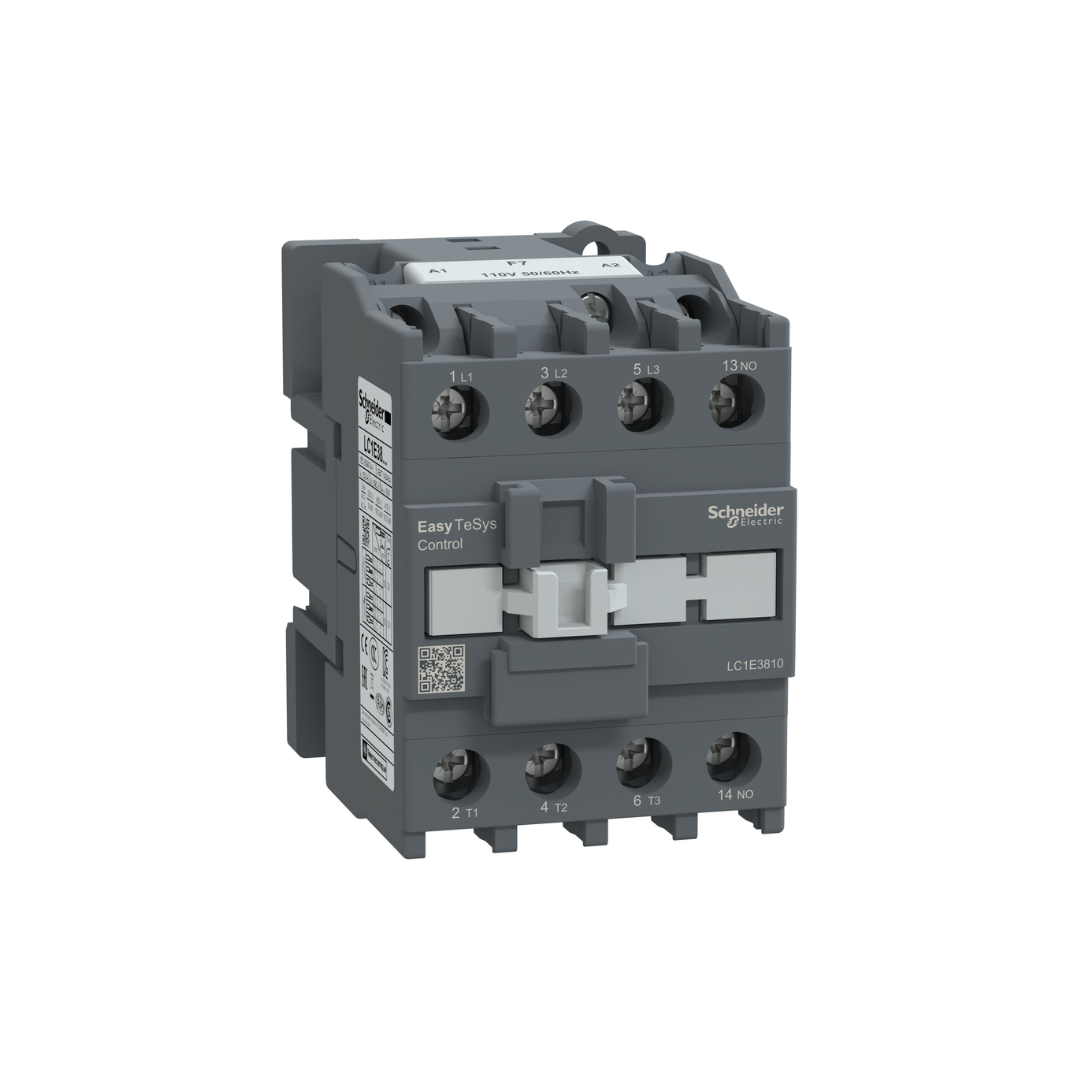 Contactor Tripolar 38A 110Vca Na de control TeSys sencillo para aplicaciones de motor de hasta 38 A 18.5kW@440V. Proporciona una bobina de CA de 110 V 50/60 Hz, contactos auxiliares integrados de 1 NA, conexiones de control y alimentación mediante terminales con abrazaderas de tornillo. Ancho de 56mm para índices operativos estándar de hasta 1800 ciclos por hora. Brinda confiabilidad y durabilidad estándar con durabilidad eléctrica de 0.9 ciclos AC-3 y durabilidad mecánica de 8 ciclos. Puede cubrir entre -5°C y 55°C de temperatura de trabajo y montado mediante riel DIN, sin disminuir la altura hasta 3000 m. Compatible con estándares múltiples (IEC, CCC, EAC) y Green Premium (RoHs/Reach).