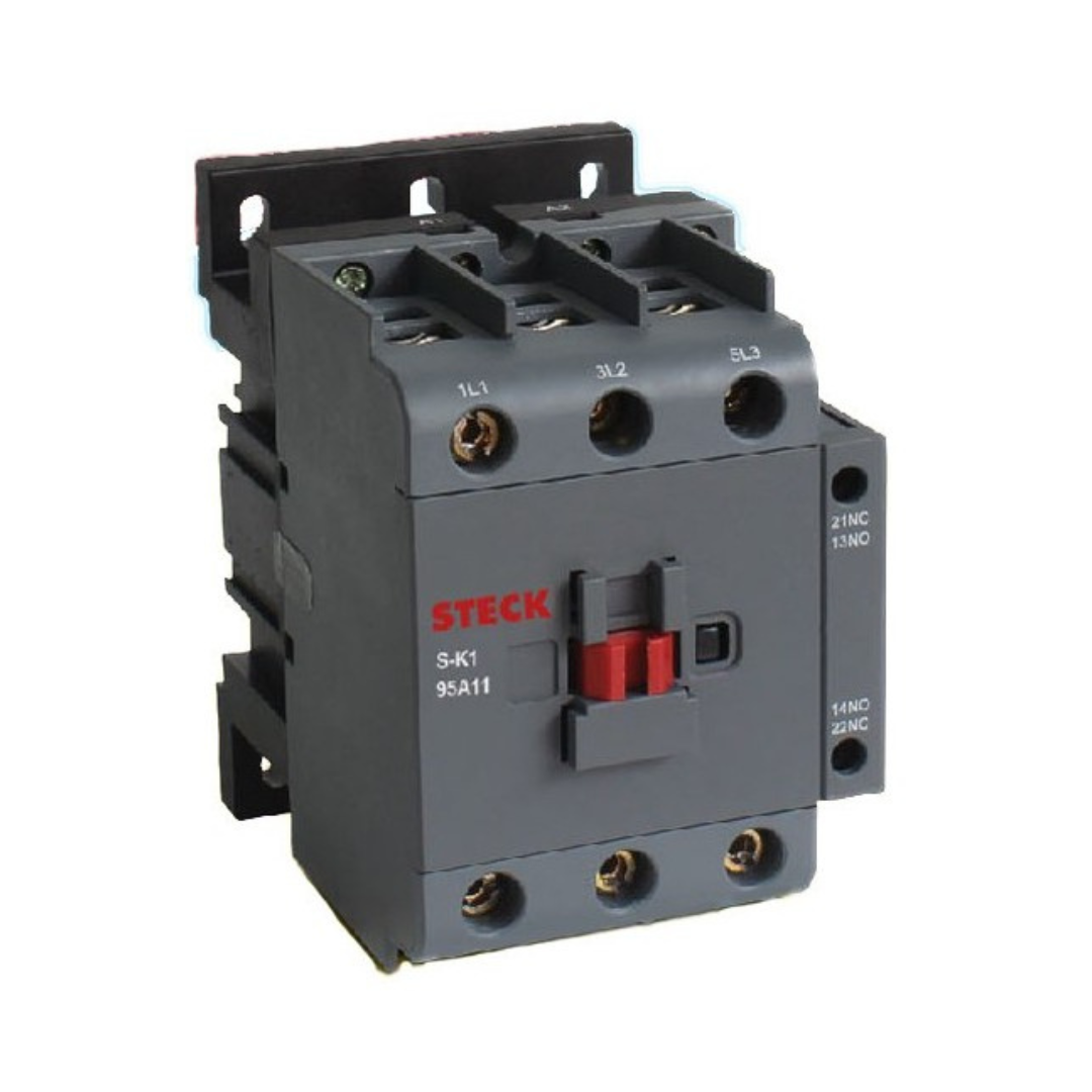 El contactor DIN de 95A de Steck está diseñado para el control eficiente de cargas trifásicas en entornos industriales exigentes. Su bobina de 220V y contactos auxiliares 1NA + 1NC lo convierten en una solución versátil para automatización eléctrica.