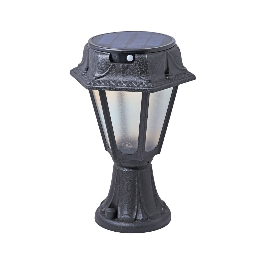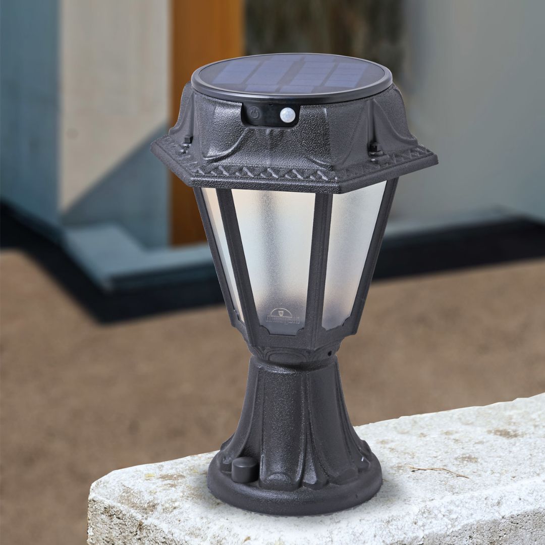 Farol solar de estilo clásico con sensor de movimiento y batería reemplazable.