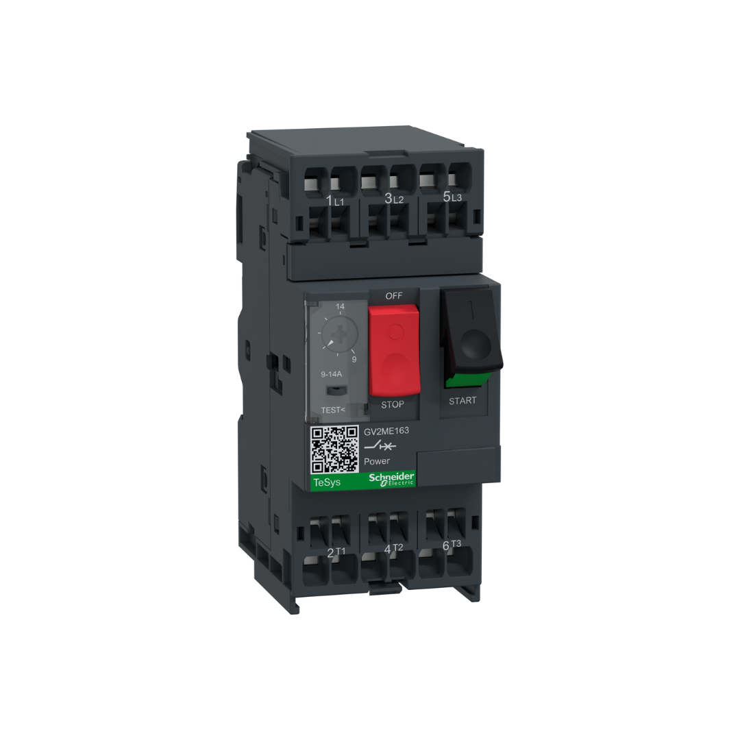 Disyuntor de motor GV TeSys, 3 polos (3P), 14 A/690 V, para aplicaciones de motor de 3 fases 5.5kW@400V. Ofrece protección termomagnética con un rango de ajuste térmico de 9 a 14 A, disparo magnético a 13 x In, alta capacidad de interrupción Icu 15kA@400V. Conexión mediante terminales de resorte.