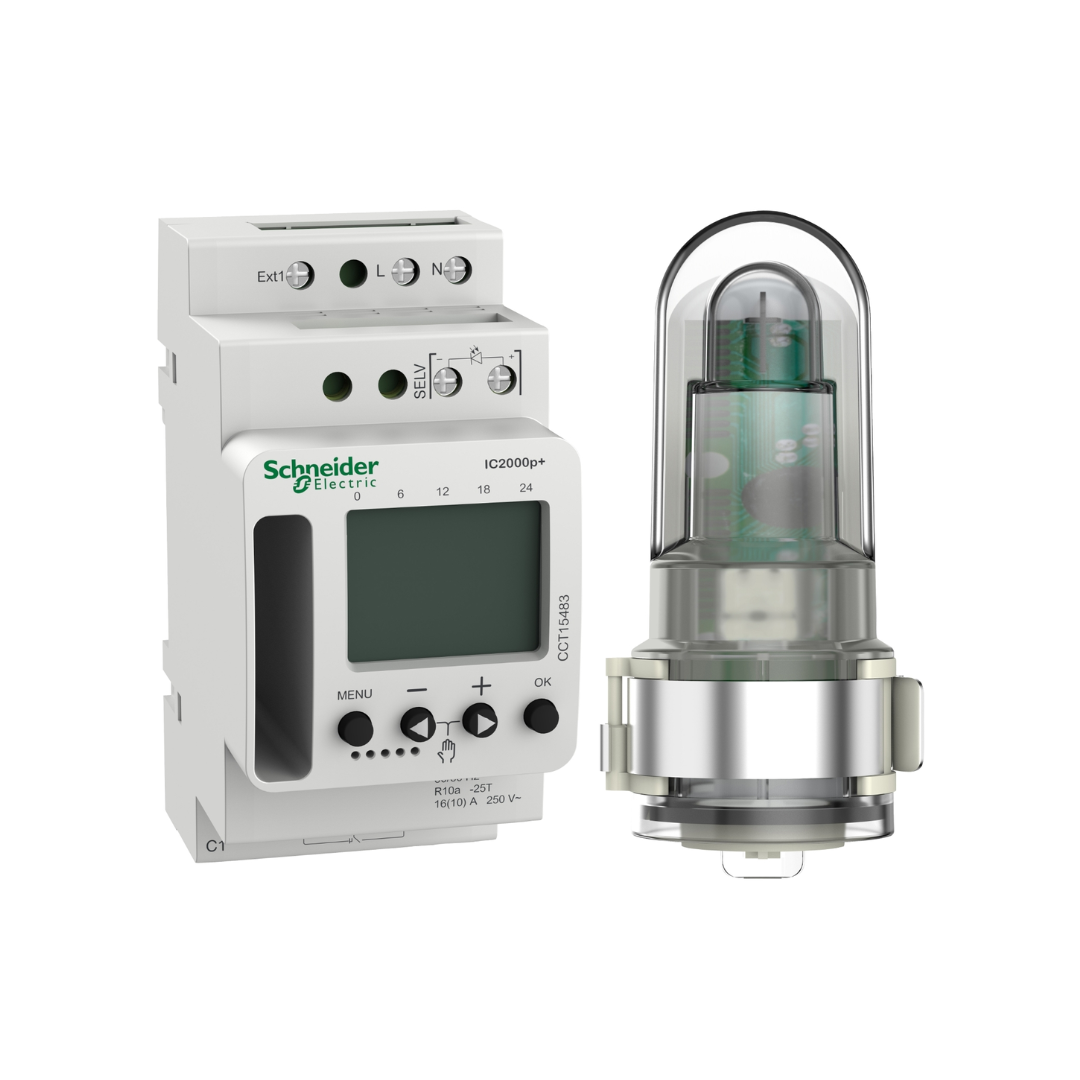 Interruptor de crepuscular digital IC2p+ Ancho de 45 mm (5 módulos de 9 mm) Para iniciar y detener una carga eléctrica de acuerdo con el nivel de luz medido entre 2 – 2. lux. El interruptor de tiempo integrado con ciclo de conmutación es de 7 días (semanal) Número de operaciones de conmutación: 56 Ahorros en la red eléctrica cortados con la reserva de la batería: 1 años Es posible realizar reemplazos manuales y remotos. Suministrado con sensor exterior de muro 1 salida de canal El soporte manual del usuario en el lado izquierdo del producto permite llegar al documento fácilmente.