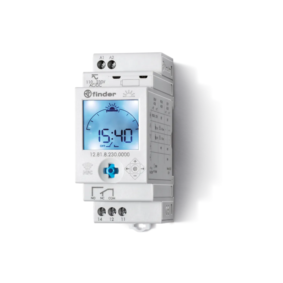 El interruptor astronómico digital tipo 12.81 es un dispositivo que ofrece dos modos de programación: “clásico” mediante joystick o “smart” mediante smartphone con tecnología NFC.