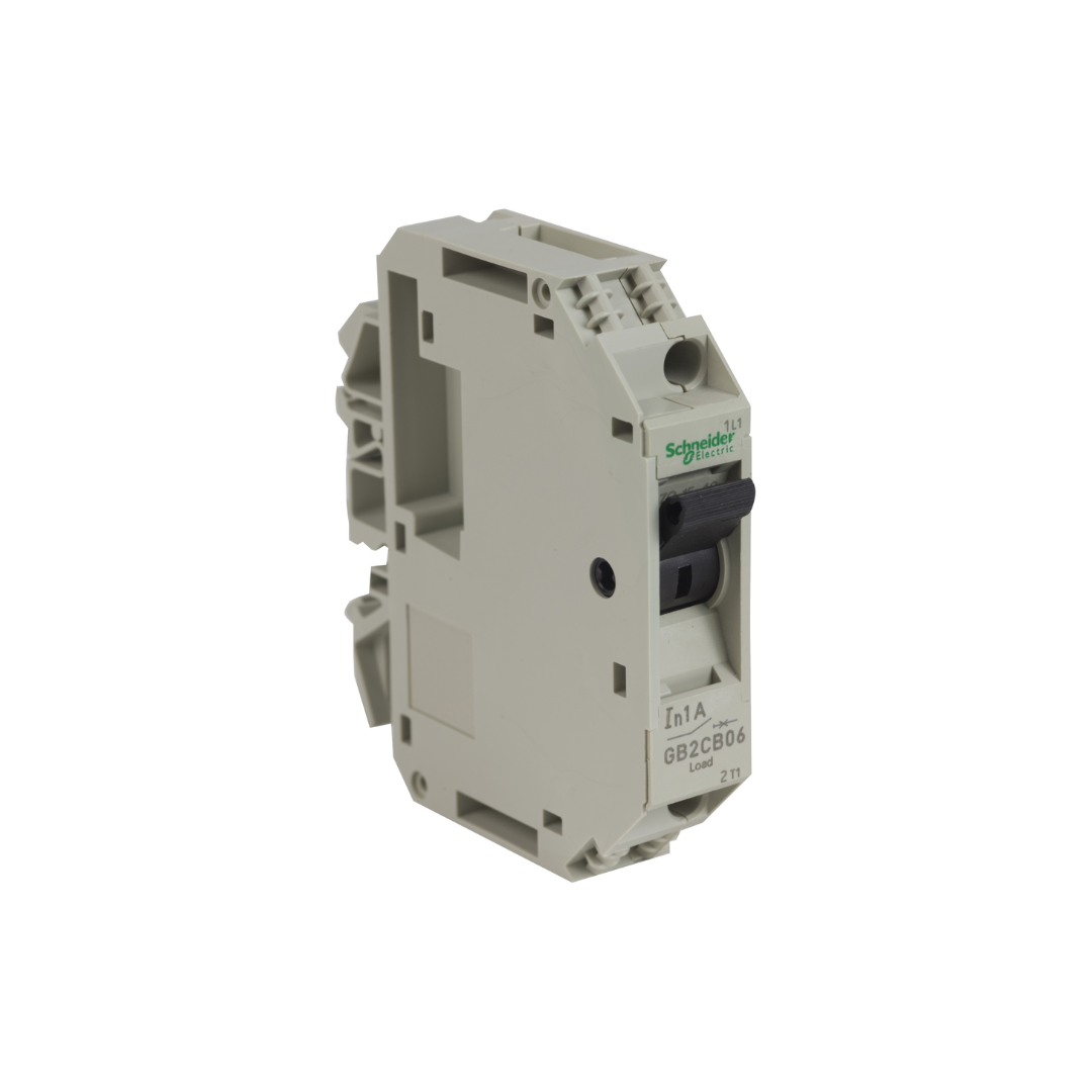 Interruptor automático TeSys GB de 1 polo (1P), 1 A/250 V IEC/277 V UL, para la protección de circuitos de control de equipos industriales. Proporciona protección magnetotérmica con un umbral de disparo magnético de 14 A (13 In) y poder de corte Icu de 50 kA a 240 V. También puede utilizarse para la protección de cargas de CC de hasta 1 A/48 V DC-13 con poder de corte Icu de 1,5 kA a 24 V. Dispositivo compacto (15mm de ancho), montaje en carril DIN de 35 mm, control por maneta conmutadora (8000 ciclos de marcha/paro garantizados). Se vende en lotes de 6 unidades. Certificado por diversas normas (IEC, UL, CSA), producto Green Premium (RoHS/REACh).