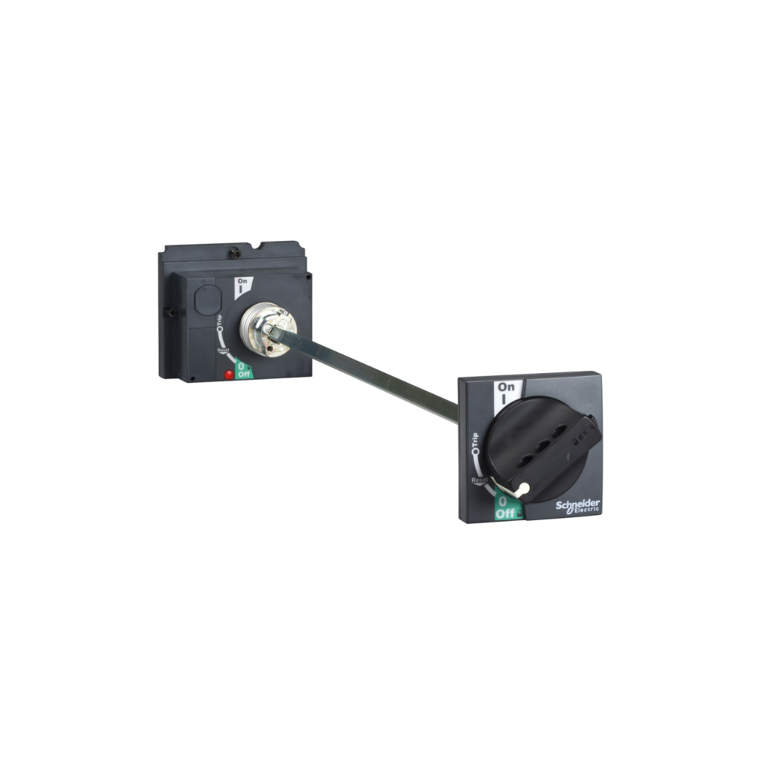 Es un asa rotativa extendida con asa telescópica para Compact NSX 1/16/25 y dispositivos de tramas H/J multiestándar PowerPact. Es apropiado para el aislamiento y se utiliza para aplicaciones estándar para dispositivos extraíbles. Mantiene el acceso a los ajustes de la unidad de disparo y al botón de disparo. Está equipado con un asa negra estándar. Hay una indicación de las tres posiciones de dispositivo O (OFF), I (ON) y disparado.