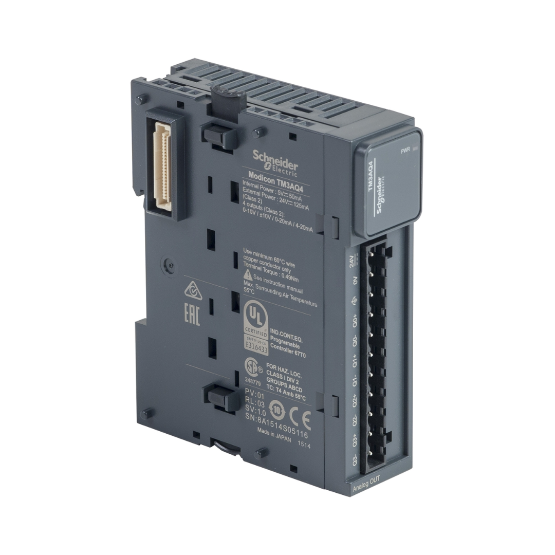 Este producto forma parte de la gama Modicon TM3, una oferta de módulos de E/S de ampliación para Modicon M221, M241, M251 y M262. El MODULO TM3AQ4 de salida analógica proporciona 4 salidas con 11 bits de signo + y 12 bits de resolución. Se trata de un módulo de salida con una tensión de alimentación nominal de 24 VCC y un consumo de corriente de 125 mA a 24 VCC a través de una fuente de alimentación externa a plena carga.