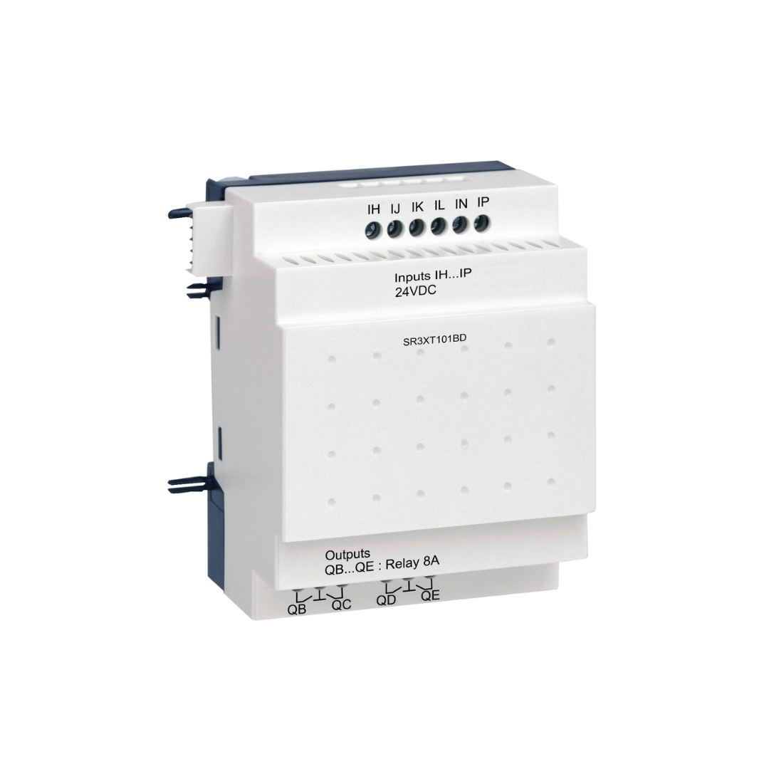 Este módulo de extensión de E/S discreta Zelio Logic SR3 utiliza un voltaje de alimentación de corriente directa de 24 V. Tiene 10 entradas / salidas de contacto con terminales de tornillo-abrazadera. Permite una programación sencilla de escalera, adaptada para no especialistas.