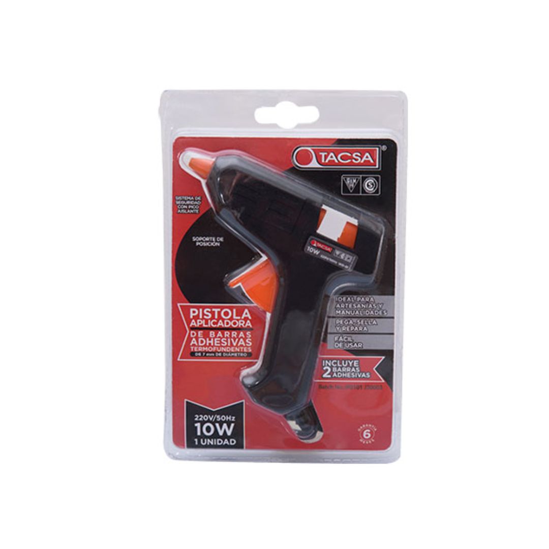 LA PISTOLA APLICADORA DE ADHESIVO EN BARRA TACSA ES UNA TERMOAPLICADORA QUE SE UTILIZA PARA ADHESIVOS TERMOFUNDENTES (HOTMELT). CUENTA CON UN GATILLO ERGONÓMICO, SOPORTE DE POSICIÓN Y AISLAMIENTO PLÁSTICO DE SEGURIDAD EN EL PICO. ES VERSÁTIL Y FÁCIL DE USAR. SE PUEDE UTILIZAR EN GRAN VARIEDAD DE MATERIALES PARA EL HOGAR, ARTESANÍAS, HOBBIES Y MANUALIDADES.