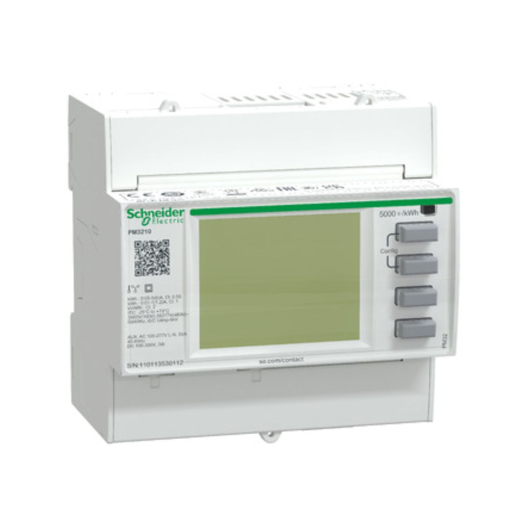 El POWER METER METSEPM3210 de montaje DIN de SCHNEIDER ELECTRIC cuenta con pantalla LCD de 128 por 96 píxeles, retroiluminada. El medidor proporciona precisión Clase 0.5S según el estándar IEC 62053-22 y 32 muestras por ciclo. El medidor medirá la energía, la potencia activa y reactiva, la tensión, la corriente, la frecuencia, el factor de potencia, la potencia aparente, la distorsión armónica total y hasta el 15.º armónico.