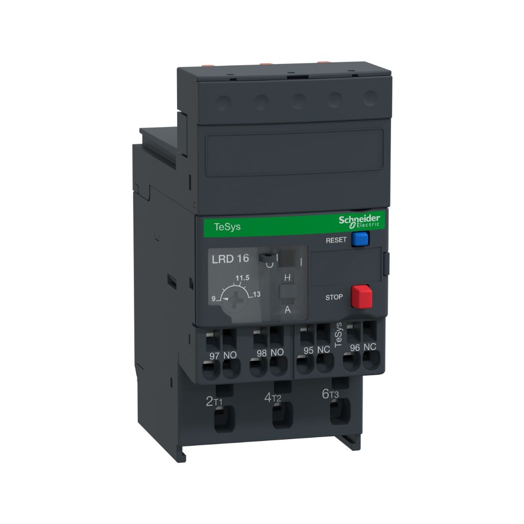 Relé Térmico 9-13A TeSys LRD, 13A/690V, clase de disparo 10A, para protección de motores trifásicos 5.5kW@400V. Dispositivo diferencial con falla de fase (pérdida). Proporciona un selector de ajuste térmico, un selector de restablecimiento manual-automático, un selector de prueba para la simulación de botones de disparo, reinicio y parada, un indicador de indicador y 2 contactos auxiliares 1NO+1NC para la señalización de fallas. Los ajustes están protegidos por una cubierta transparente bloqueable mediante sellado.