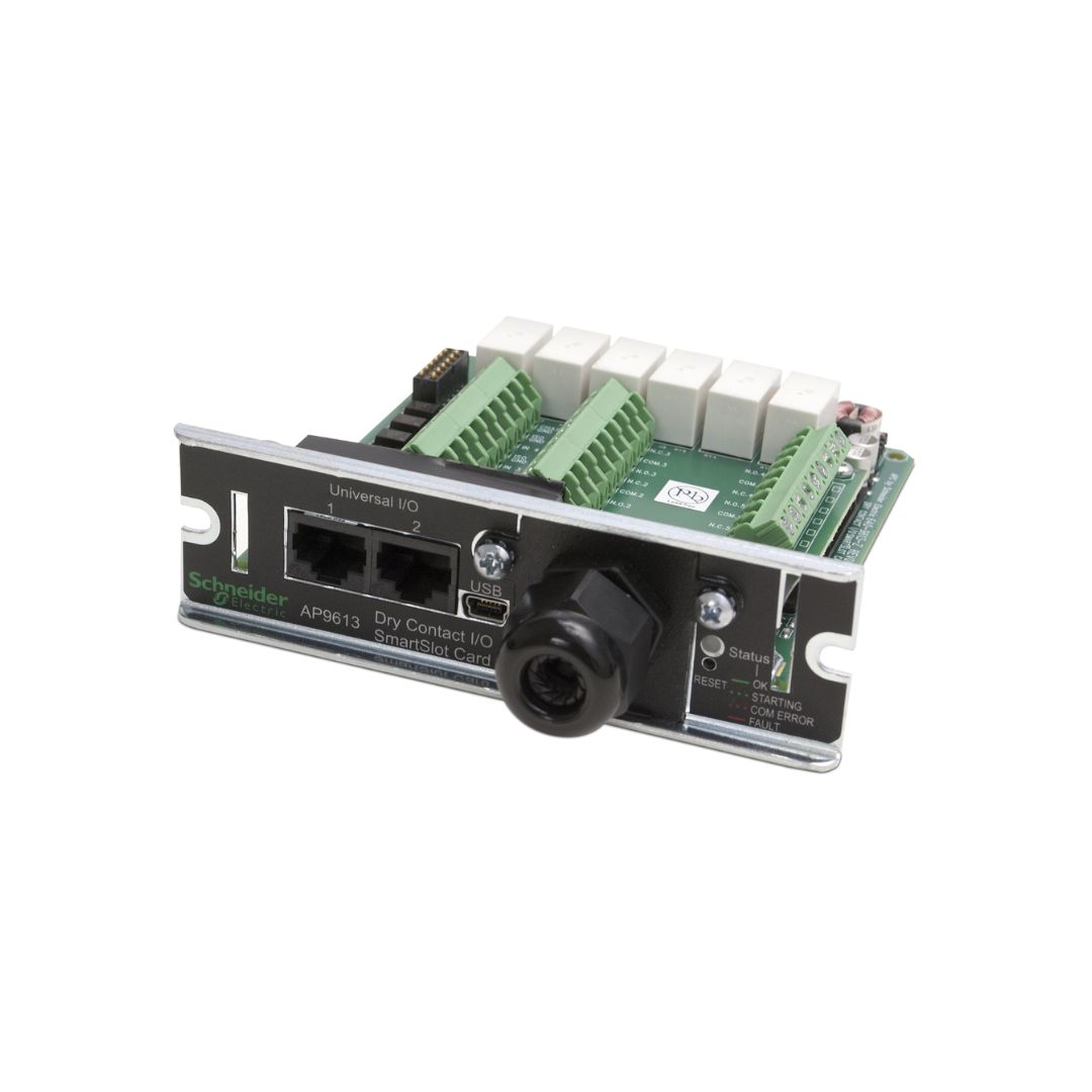 La tarjeta de contacto seco proporciona 6 relés de salida configurables y 4 contactos de entrada para monitorear activadores externos e iniciar acciones en dispositivos externos. Los 2 puertos universales de E/S (UIO) soportan sensores ambientales opcionales y el accesorio de E/S de contacto seco. El accesorio de E/S de contacto seco proporciona 2 interfaces adicionales de entrada y salida de relé de contacto seco.