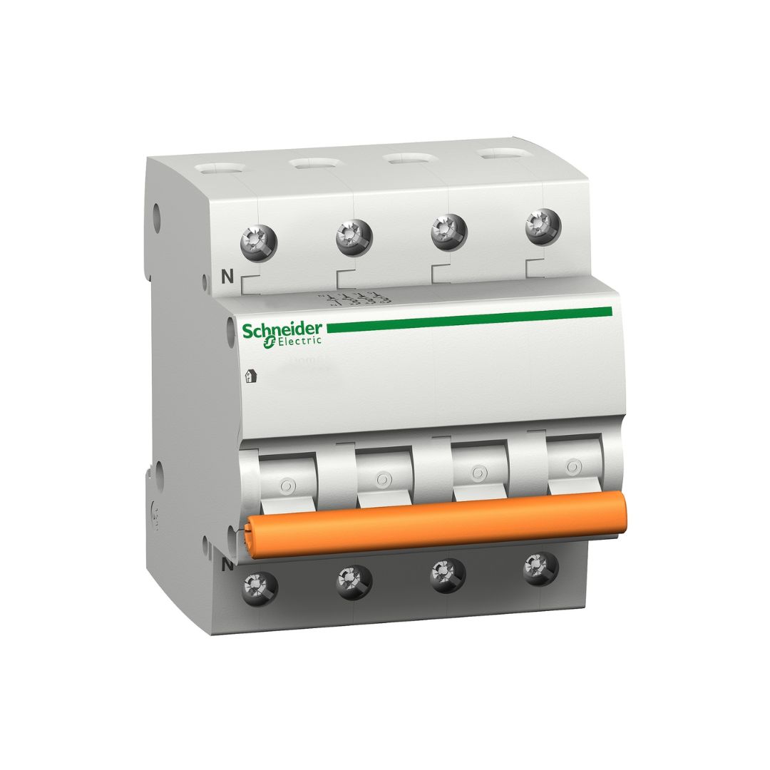 Este TERMICA 4 POLOS DOMAE producto cumple con la norma IEC 60898-1. Este interruptor automático miniatura combina funciones de protección contra cortocircuitos y sobrecargas, control y aislamiento. El disparo por fallo se indica en el panel frontal mediante la posición de la maneta (OI grabada). Tiene una resistencia eléctrica de hasta 10 000 ciclos y una resistencia mecánica de hasta 20 000 ciclos. La tensión de funcionamiento (Ue) es de 400 V CA.