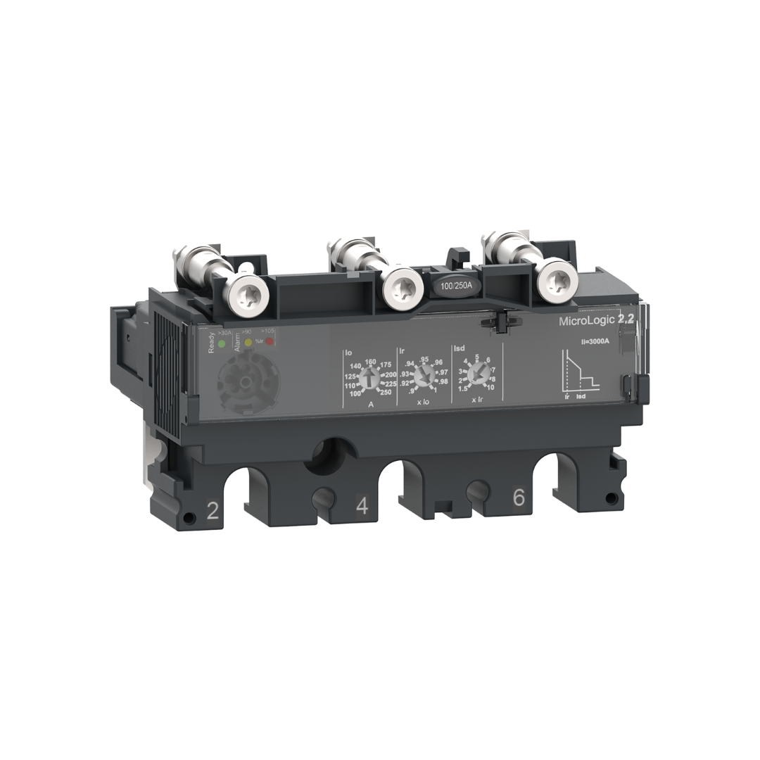 Incorpora una protección ajustable de largo tiempo contra sobrecargas. También ofrece una protección ajustable de corto tiempo y una protección instantánea fija contra cortocircuitos. MicroLogic 2.2 indica sobrecargas con LED de alarma.