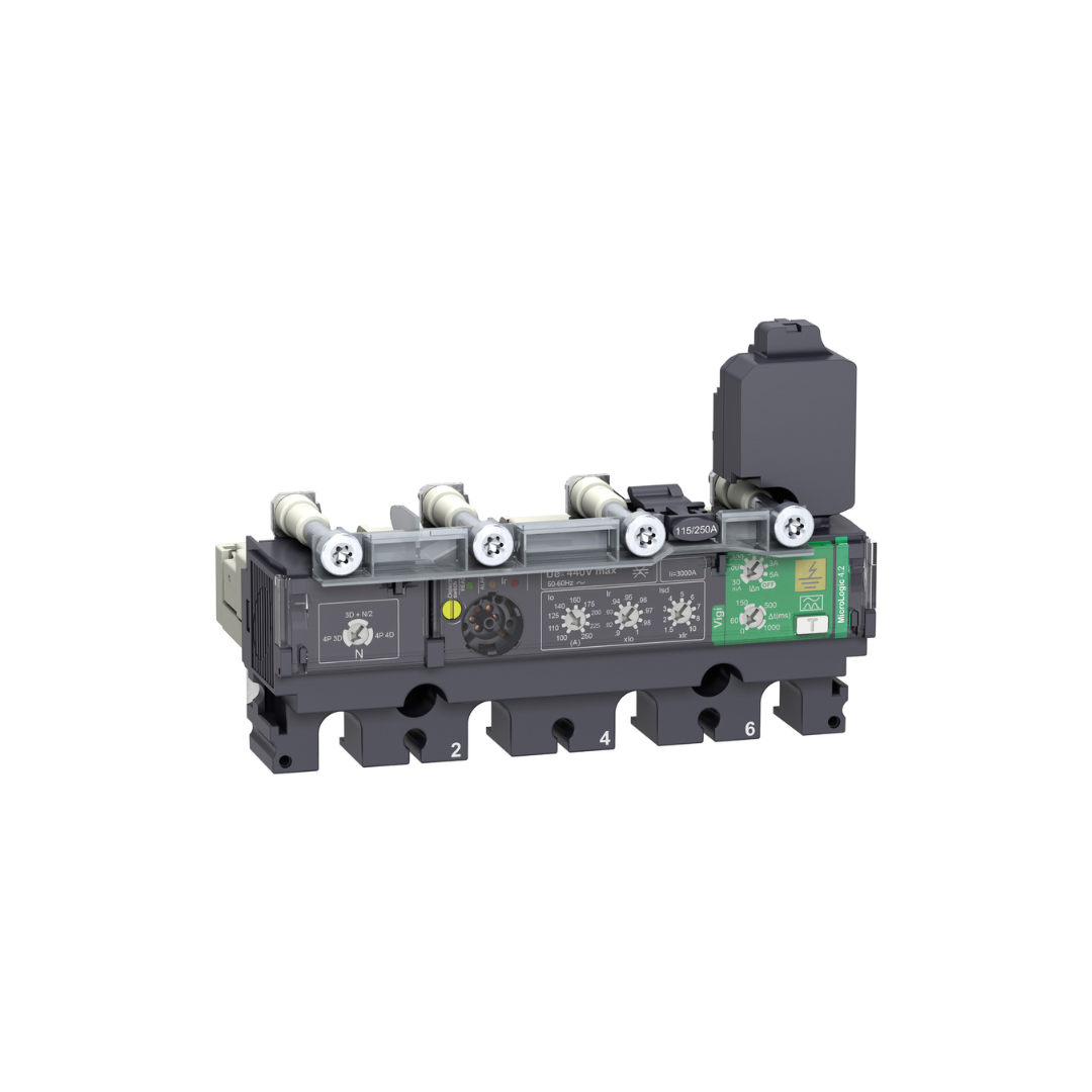Esta unidad de control Micrologic 4.2 es una unidad de desconexión electrónica 4d de 4 polos que se utiliza en los interruptores automáticos Compact NSX 250.
